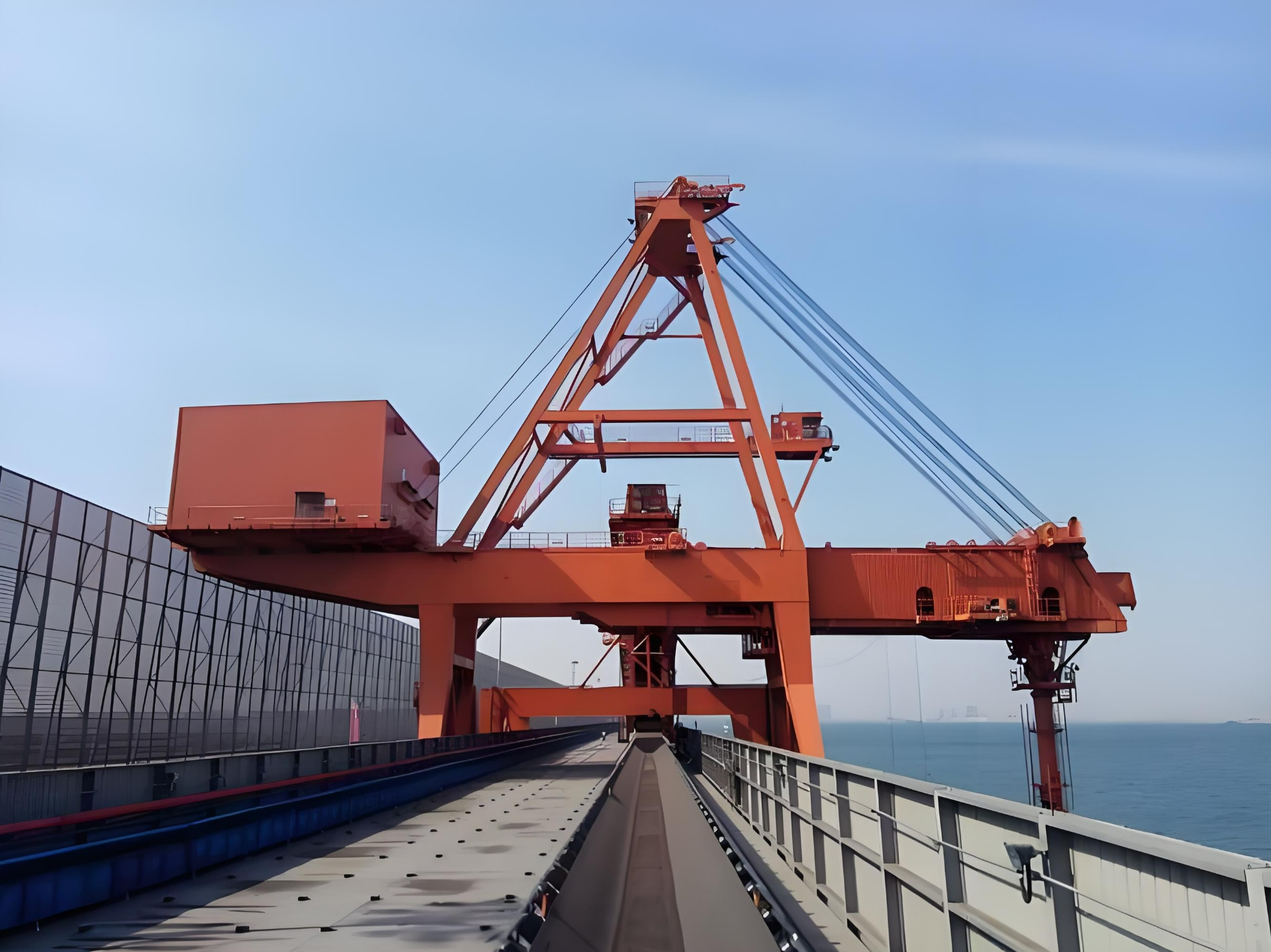 大型橋式抓斗卸船機是用來將固態(tài)散裝貨物從船艙運至碼頭上的煤料傳送帶上的大型設(shè)備。